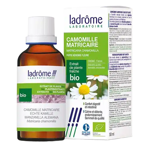 Tinctuur Het Kamille tinctuur van Ladrôme is biologisch en heeft een hoog gehalte aan actieve bestanddelen. Een tinctuur is een soort extract waarbij alcohol als oplosmiddel wordt gebruikt om de bestanddelen van een kruid of hars te benutten.