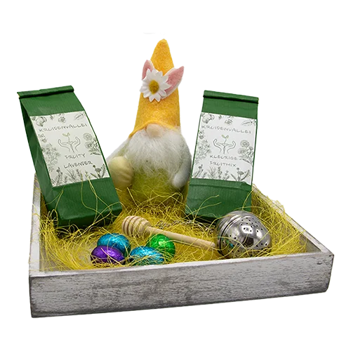 Vier de lente met een kruidenvallei paaspakket. Een heerlijk theepakket in cadeauverpakking, met twee kruidenmelanges van ieder 50 gram om de zon te verwelkomen en om helemaal in de stemming te komen tijdens deze lenteperiode. Geserveerd op een houten dienblad, leuk aangekleed met een honinglepel, paaseitjes en uiteraard kan een thee-ei en een paasgnoom niet ontbreken. Speciaal voor deze feestelijke gelegenheid ons cadeau-paaspakket in aanbieding: Tot aan Pasen van €24,99 voor €17,99. Geef jezelf of een ander dit gezellige paaspakket.