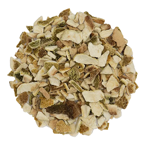 Sinaasappelschil wordt gewonnen door de schil van de sinaasappel te drogen. Een sinaasappel is de vrucht van de sinaasappelboom (Citrus sinensis) die tot het geslacht Citrus behoort en heeft een heerlijke zoete sinaasappelgeur en smaak. Sinaasappel werkt op: immuunsysteem, bloed, psyche, huid en spijsvertering. Onze sinaasappelschil is biologisch ingekocht, 100% natuurlijk en zonder toevoegingen